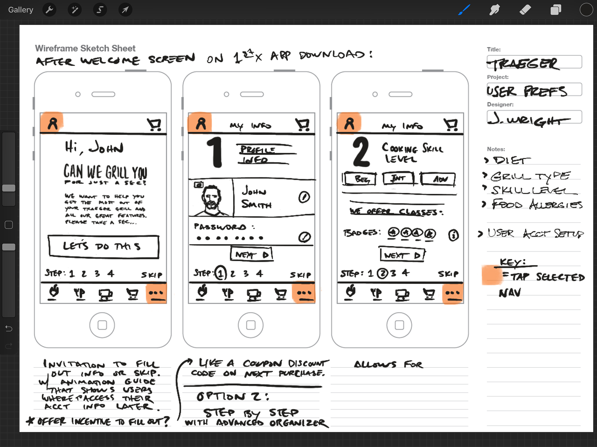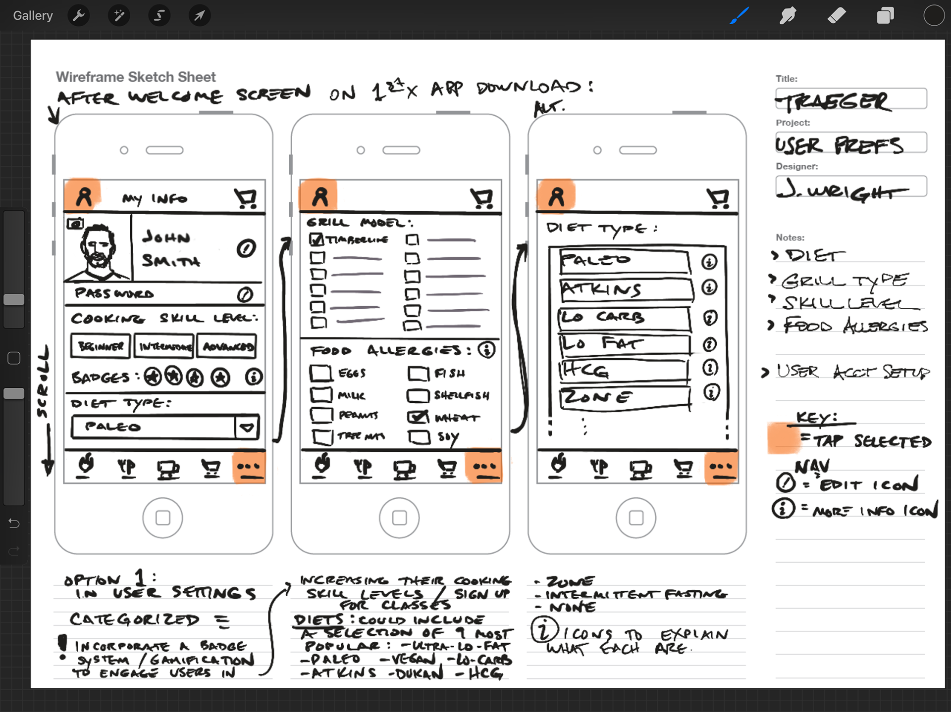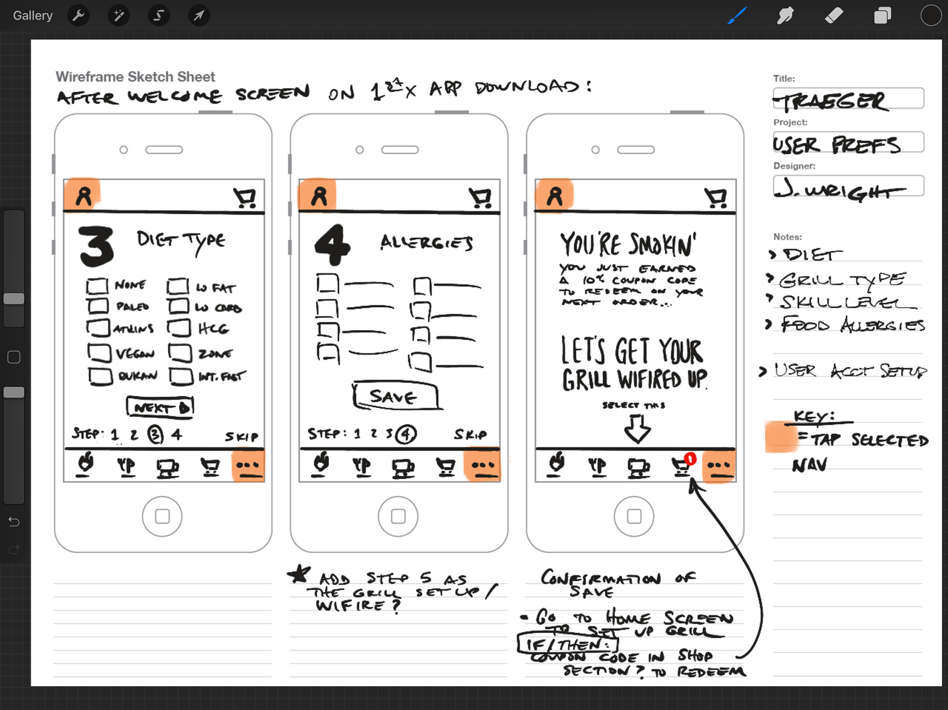 OVERVIEW: Traeger Grills provides an amazing feature to their grills that allows grillers to control via mobile app their temperature settings, cook times, access to recipes, and much more. They wanted a way to capture even more useful user preferences in order to customize the app and better serve their customers. I provided ideation, strategy, and low fidelity to high fidelity comps to meet the challenge of how to go about capturing this additional user information. Traeger already had an incredible amount of data from a pool of hundreds of thousands of existing customers. The challenge was how to organize this data to determine useful monetizing opportunities.